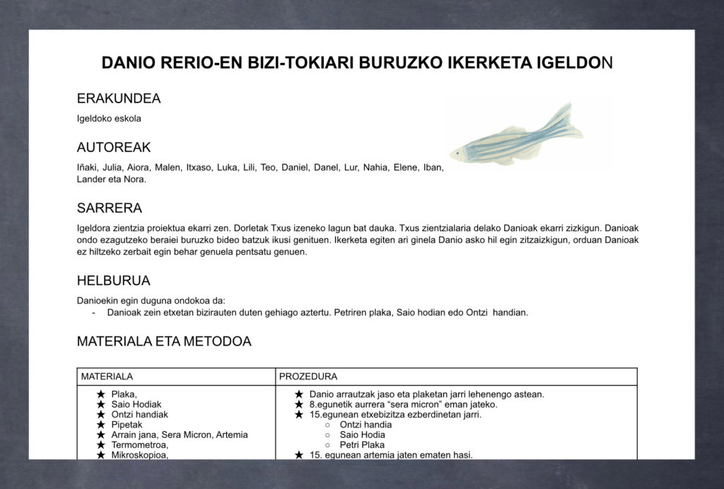 L@s alumn@s del colegio Igeldo han hecho este póster científico parar comunicar el resultado de sus experimentos sobre cuál era la «casa favorita de Danio». Cuando un grupo de investigación descubre algo relevante, lo pone en conocimiento de la comunidad científica por distintos mecanismos. Un póster científico es uno de ellos.